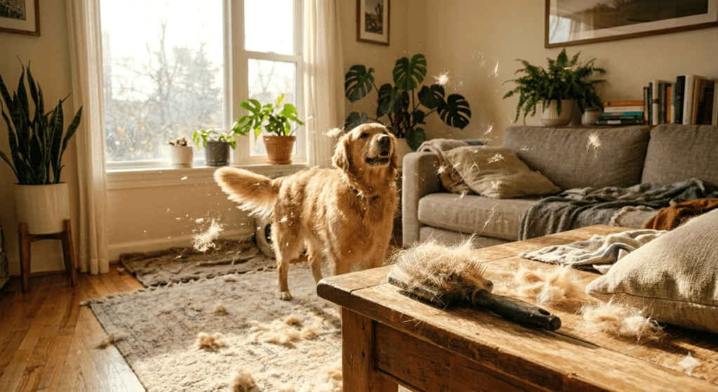 Shedding fur was treated not as a nuisance, but as a storytelling device. In “before” moments, fur becomes visual tension: floating through the air, coating furniture, disrupting space. The mess is intentional and amplified to heighten the problem.